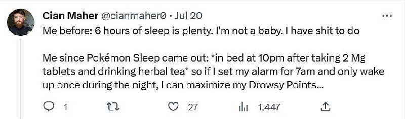 Я после выхода Pokémon Sleep: *в постели в 22:00 после приема 2 таблеток магния и травяного чая*, потому что если установить будильник на 7 утра и проснуться максимум один раз в течение ночи, можно максимизировать свои баллы сна…»