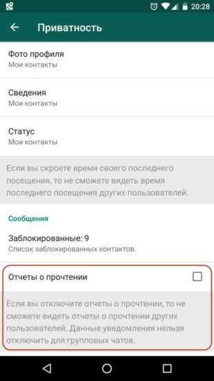 Имейте ввиду, что при отключении отчетов информацию о прочтении перестанут получать не только ваши собеседники, но и вы. В WhatsApp действует равноправие.