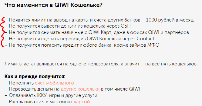 Вывести средства с кошелька на карты и счета других банков все еще можно, но даже тут установили смешной лимит – не более 1000 рублей в месяц. Также нельзя переводить деньги через сервис Contact, а еще гасить через QIWI кредиты в сторонних банках.