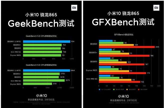 Также производители опубликовал результаты тестирования смартфона в бенчмарках Geekbench 5.0 и GFXBench, которые демонстрируют производительность процессора Snapdragon 865. В Geekbench Xiaomi Mi 10 набрал 934 балла в одноядерном и 3464 балла в многоядерном тесте, опередив конкурирующие чипсеты Kirin 990 и Exynos 9825.