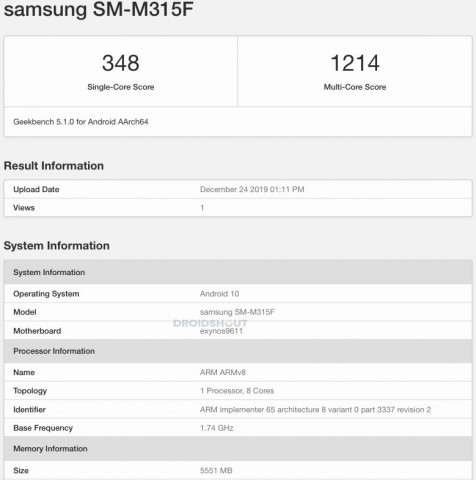 Samsung Galaxy M31 будет работать на процессоре Exynos 9611 в паре 6 ГБ оперативной памяти. В тесте Geekbench он набрал 348 баллов в одноядерном режиме и 1214 баллов в мультикоре, что сравнимо с результатами Galaxy M30s, который оснащен таким же железом. То есть никакого прогресса в производительности от новинки ждать не стоит.