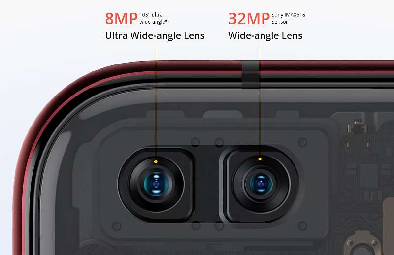 Фронтальная камера расположена в двойном отверстии в экране, она состоит из главного датчика Sony IMX616 на 32 МП и 8-мегапиксельного сверхширокого модуля для съемки групповых селфи.