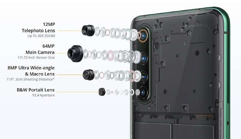 Realme X50 Pro получил 4 камеры с главным модулем на 64-мегапикселя и объективом f/1.8. Он дополнен 8-мегапиксельним шириком с апертурой f/2.3 и автофокусом, телевиком на 12 МП (f/2.5) и четвертым черно-белым датчиком глубины, который используется для размытия в портретном режиме.