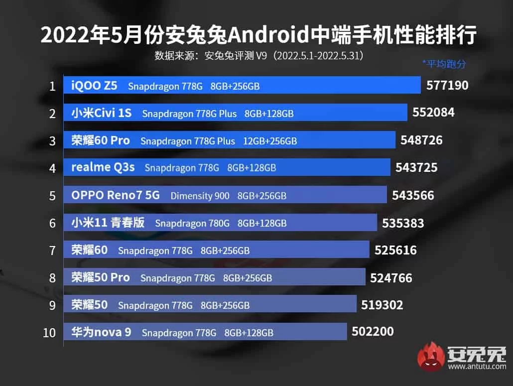 Кроме того, в рейтинг попали такие смартфоны как: Vivo X80, iQOO 9, iQOO 9 Pro, Vivo X 80 Pro причем в двух версиях – с Dimensity 9000 и Snapdragon 8 Gen 1, Vivo X Note и Motorola Edge X30.