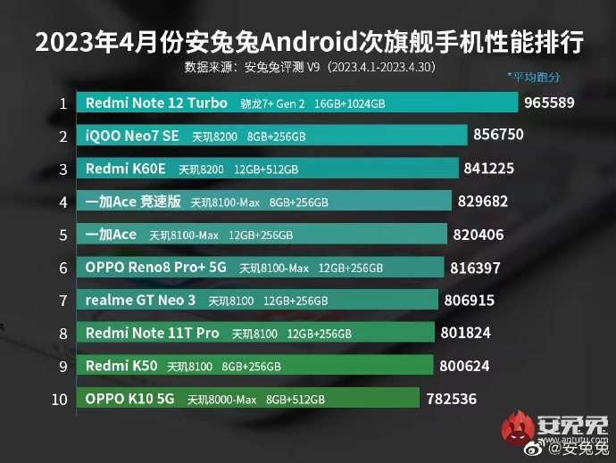 Среди субфлагманов ситуация чуть более разнообразная. В одну калитку всех вынес Redmi Note 12 Turbo, который построен на новом чипе Snapdragon 7 Gen 2. Расположившийся на втором месте iQOO Neo7 SE с Dimensity 8200 проигрывает лидеру почти 110 тысяч баллов.