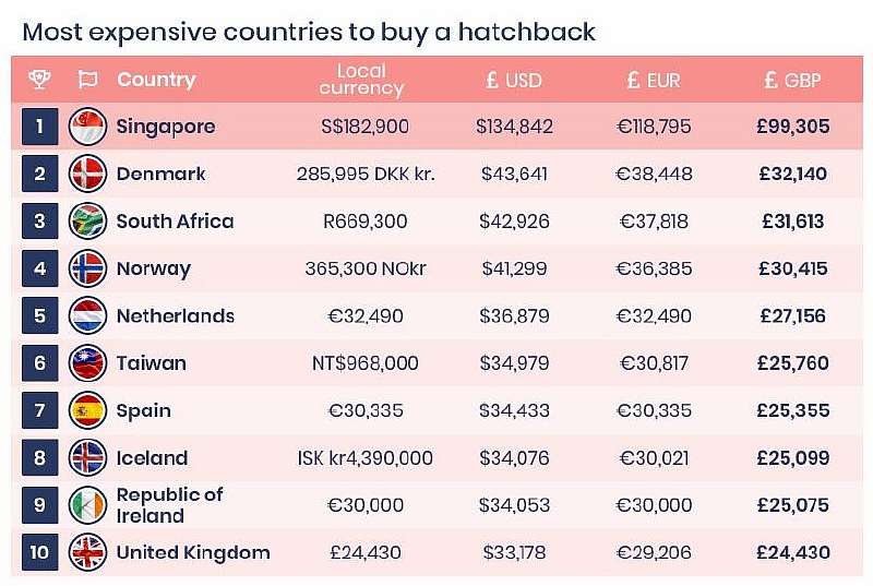 Вот рейтинг остальных стран с самыми дешевыми хэтчами: