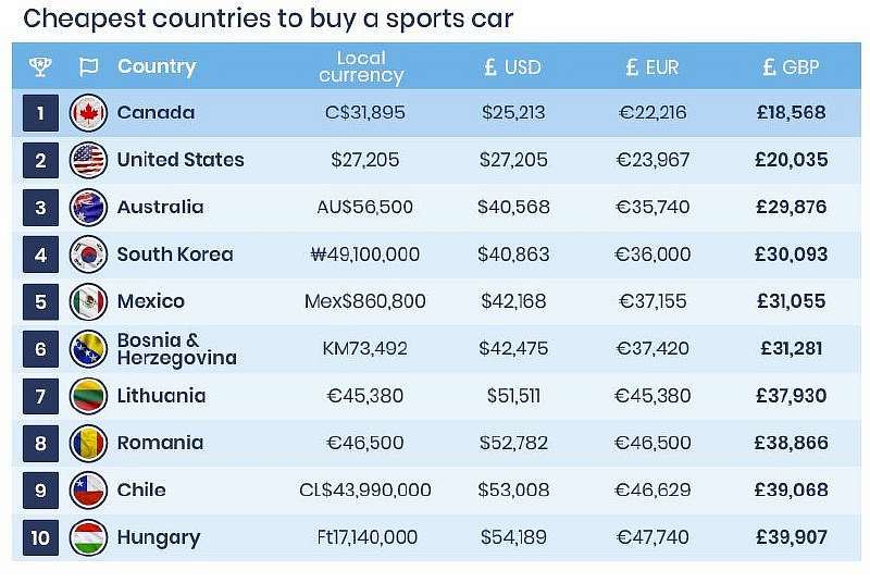 …в Канаде. Легендарный Ford Mustang тут внезапно стоит всего 25 000$. Чуть дороже придется заплатить за пацанскую мечту американцам. А с 3 места и дальше цена уже не кажется такой сказочной.
