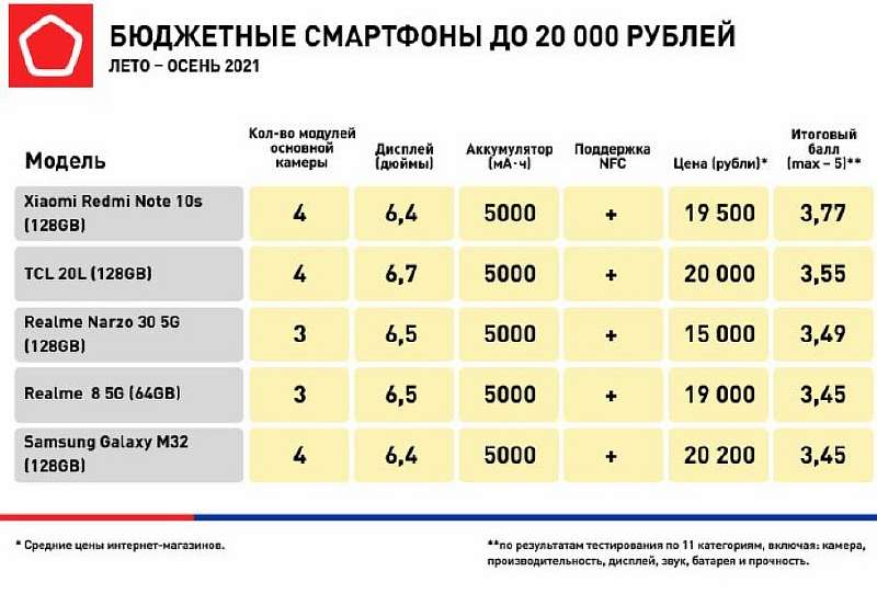 Некоммерческая организация «Российская система качества» (Роскачество) провела тестирование и опубликовала рейтинг с лучшими бюджетными смартфонами за лето-осень 2021 года. По мнению экспертов, в ценовом сегменте до 20 000 рублей стоит обращать внимание на модели Samsung, Realme и Xiaomi.