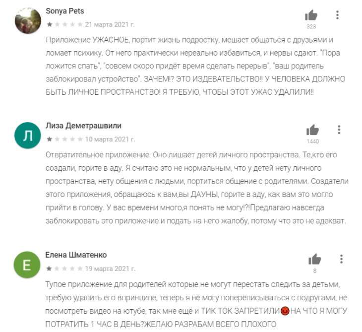 В общем, крайне полезная программа для родителей. Вот только сами дети от нее, мягко говоря, не в восторге. Им ограничивают время пользования социальными сетями, не дают залипать в TikTok и играть в мобильные игры. Когда упрашивания не помогают, а истерики чреваты знакомством с отцовским ремнем, у школьников остается только одна возможность для протеста – ставить приложению низкие оценки и жаловаться в комментариях.