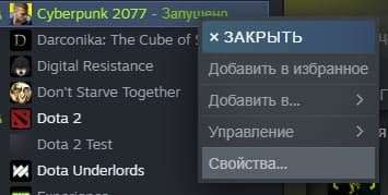 - Для этого нужно зайти в Стим, в списке доступных игр найти CyberPunk 2077, вызвать контекстное меню и перейти в «Свойства».