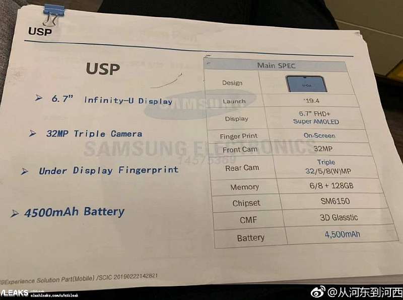 При взгляде на фотографию списка со спецификациями устройства невольно ловишь себя не мысли, что речь не может идти о смартфоне Samsung среднего ценового сегмента. Но, если утечка подтвердится, на рынок выйдет очень достойный аппарат с 6.7 дюймовым SuperAMOLED FHD+ дисплеем со встроенным сканером отпечатков пальцев, процессором Snapdragon 675, тройной основной камерой на 32+5+8 МП, фронталкой на 32 МП и аккумулятором емкостью 4500 мАч. Также, очевидно, смартфон получит порт Type-C и NFC модуль.