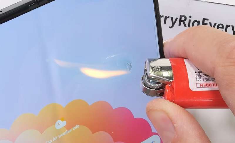 Испытания традиционно начались с дисплея. Стекло Corning Gorilla Glass Victus 2, защищающее внешний экран, удалось поцарапать кернером твердостью 6 – это стандартный результат. А вот гибкий полимер на внутреннем дисплее пострадал уже от кернера-двойки. Подвел он и на тесте зажигалкой, 10 секунд контакта с огнем хватило, чтобы поверхность начала плавиться. Но, как объяснил блогер, другого исхода с этим материалом быть не могло.