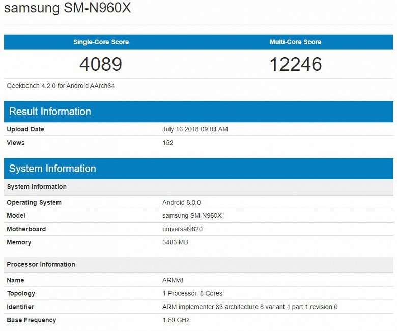 Похоже вскоре мы увидим новый самый мощный смартфон в мире. Им станет Samsung Galaxy Note 9 – внезапно: на процессоре Exynos. Сегодня в базе данных бенчмарка Geekbench замечен ожидаемый флагман от корейского производителя с модельным номером SM-960X, оснащенный новейшим процессором Exynos 9820, результаты тестирования которого вы можете увидеть ниже.