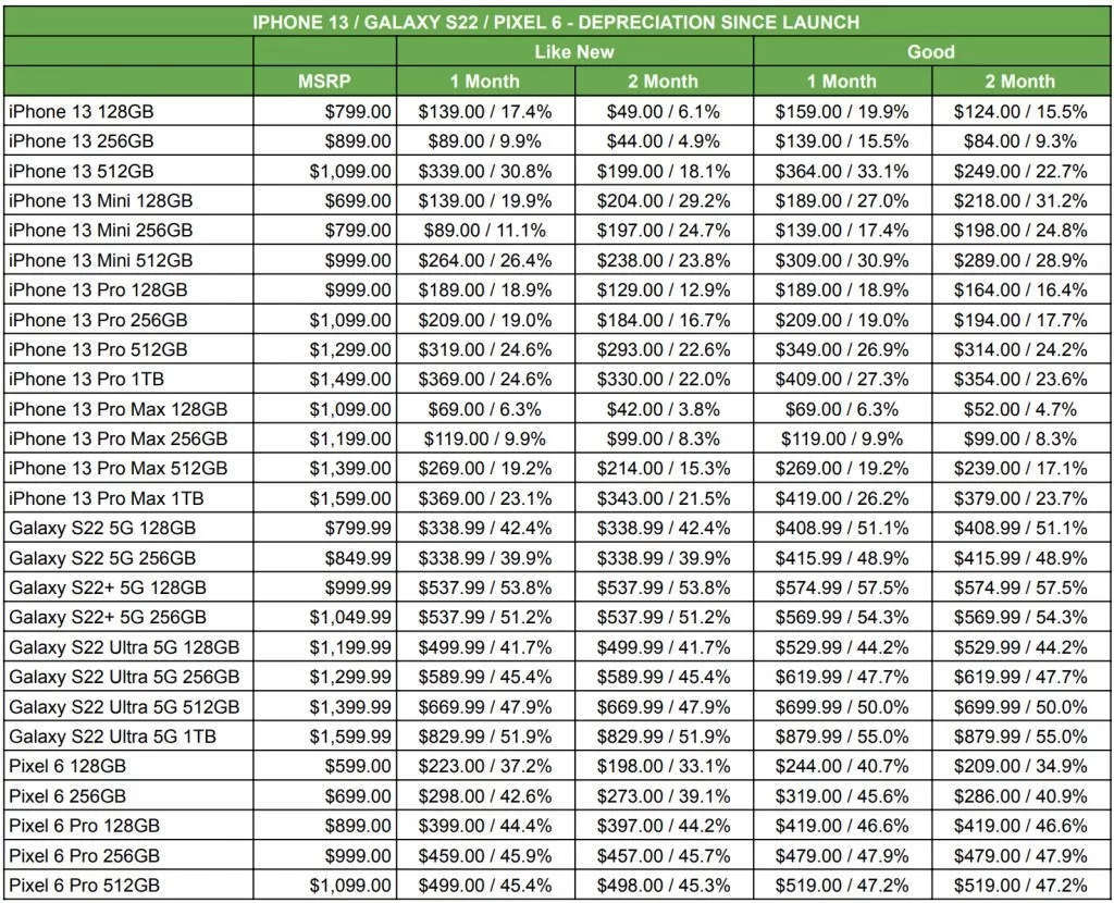 Согласно данным сайта, флагман Samsung Galaxy S22, вышедший всего 3 месяца назад, уже подешевел почти на половину – 47%. Другой Android-флагман – Google Pixel 6 скинул в цене 42%. Для сравнения, iPhone 13 подешевел всего на 16%. Видимо, прошлогодние исследования, сообщавшие, что iPhone 13 в теории может стать наименее обесценивающимся телефоном Apple, подтверждаются.