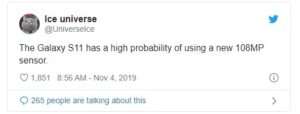 Из попавших в сеть утечек мы знаем, что Galaxy S11 будет оснащен 108-мегапиксельной камерой на базе датчика ISOCELL Bright HMX, который разработан Samsung совместно с компанией Xiaomi. Однако по информации авторитетного инсайдера @IceUniverse, корейцы будут использовать новый, еще не анонсированный сенсор с аналогичным разрешением, а не тот, который станет основой камеры грядущего Xiaomi CC9 Pro / Mi Note 10.