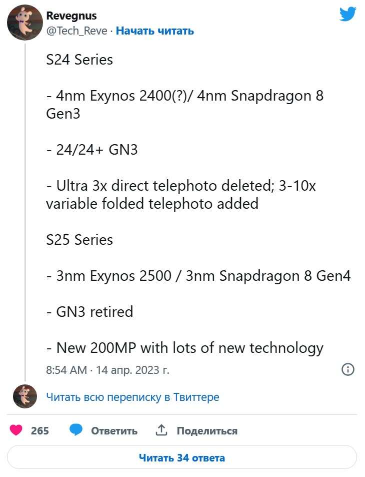 Кроме того, Revegnus приоткрыл первую информацию о серии Galaxy S25, которую Samsung готовит на 2025 год. Там следует ожидать развертывания двух разных 3-нм процессоров, а именно Exynos 2500 и Snapdragon 8 Gen 4, устаревший фотосенсор GN3 в базовых версиях, и совершенно новую матрицу на 200 МП с кучей передовых технологий во флагманском Galaxy S25 Ultra.