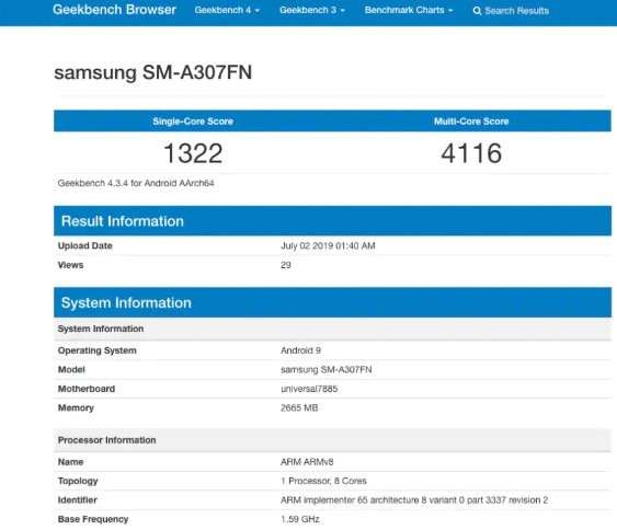 Также смартфоны были замечены в бенчмарке GeekBench, по результатам тестирования в котором стало известно об использовании в Galaxy A30s процессора Exynos 7885 с 3 ГБ оперативной памяти. Также A30s получит тройную камеру, что станет существенным апгрейдом в сравнении с предшественником, у которого только два основных модуля. Известно, что емкость аккумулятора и диагональ экрана в A30s не изменятся и составят 4000 мАч и 6.4 дюйма соответственно.