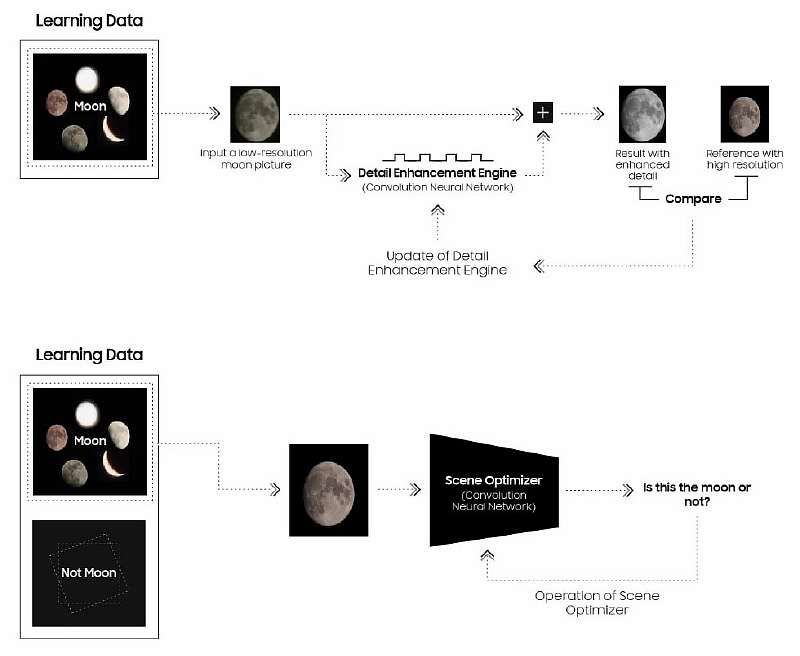 Так как же вкратце выглядит весь процесс съемки? Когда Samsung Galaxy распознает спутник Земли и отрегулирует яркость, пользователь может нажать кнопку и запустить процесс «проявки» фотографии. Камера делает мульти-шот и объединяет более 10 снимков, сделанных с 25-кратным увеличением. Затем вступают в действие оптимизатор сцены и магия ИИ, которые применяют к фотографии ряд «улучшений». Модель искусственного интеллекта обучена на снимках луны в различной форме, от первой четверти до полнолуния. И если исходных условий недостаточно для четкого фото, например Луна частично закрыта облаками, ИИ действительно накладывает предустановленную текстуру, чтобы улучшить детализацию фото.