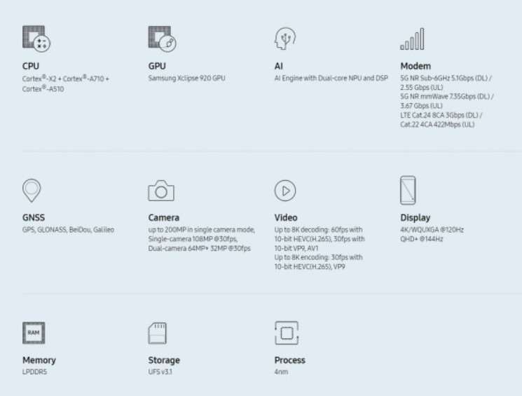 Новинка выполнена по 4-нанометровому техпроцессу и оснащена новыми ядрами Armv9. Архитектура аналогична той, что используется в последних решениях Qualcomm и MediaTek: одно супер-производительное ядро Cortex-X2, три Cortex-A710 средней мощности и квартет энергоэффективных Cortex-A510. Частоту ядер и данные о кеше Samsung пока не раскрывает.
