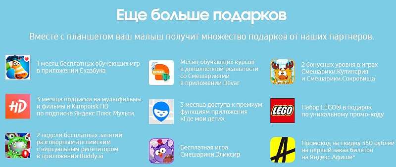 В подарок к Galaxy Tab A 8.0 Kids Edition дают специальный противоударный чехол с подставкой и различные бонусы от партнеров. Если хотите порадовать своего ребенка на Новый Год – вот ссылка на планшет в официальном магазине Samsung.