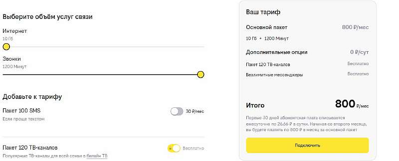 Фиксированные тарифы Билайна дороже предложений других операторов, поэтому не так интересны. Однако у желтых есть тариф-конструктор «Твое решение», которое можно гибко настроить под свои нужды.