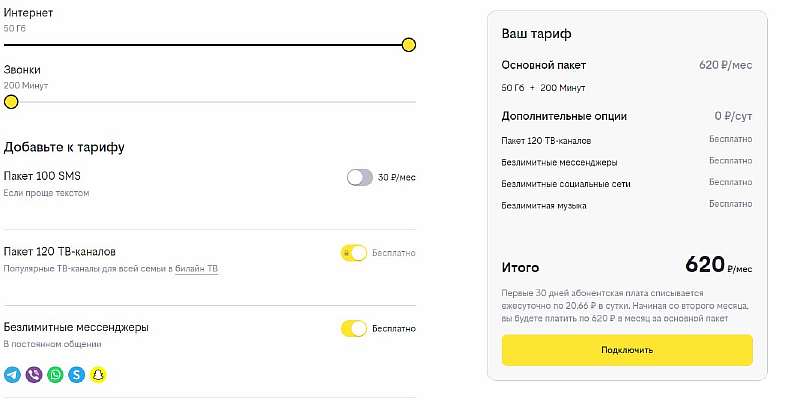 У Билайна, опять же, нам подходит тариф-конструктор «Твоё решение». Если выбрать минимальное количество минут, и максимально доступный объем трафика, получается: