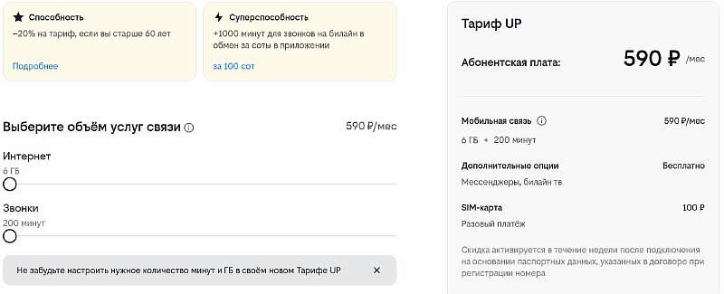 Такой тариф будет стоить 590 рублей в месяц. Но мы советуем сразу ставить 400 минут, пакет увеличится вдвое, а цена вырастет всего на +20 рублей. В отличие от «Простого» полностью отказаться от интернета на тарифе UP нельзя, но по современным меркам даже так он вполне неплох. Особенно с учетом скидки для пенсионеров.