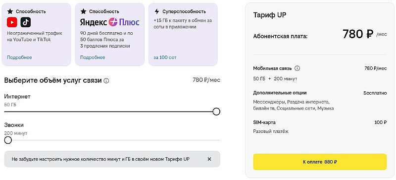 Если нужен самый дешевый тариф Билайн с интернетом для смартфона, рекомендуем настроить «UP» с аппером Дракон Юнг. В правильной конфигурации за 790 рублей в месяц он дает: