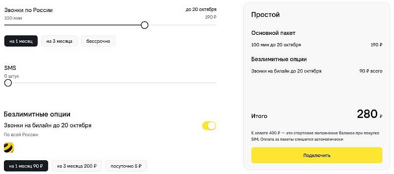 - 200 минут на номера других операторов в домашнем регионе и номера Билайн по России, безлимит внутри сети после исчерпания пакета;
