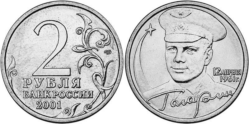 К 40-летнему юбилею полета первого человека в космос в 2001-м году была выпущена памятная монетка. На ее орле красуется Юрий Гагарин, а ценник на сегодняшний день начинается от 3000 рублей. Но, опять же, редкими считаются только монеты без знака монетного двора. Рубли с буквой «М» никому из нумизматов не нужны.