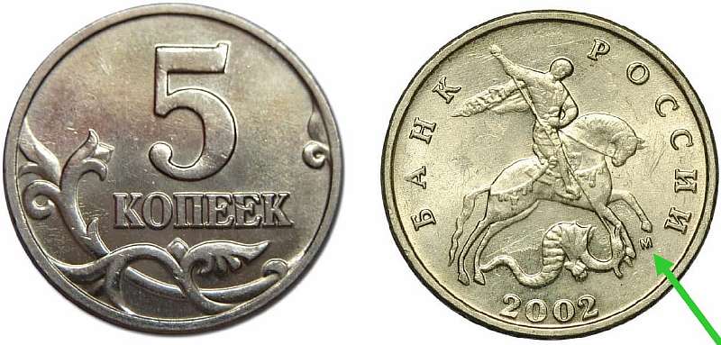 Обнаружив у себя 5 копеек 2002-го года выпуска, можно заработать 2000-10000 рублей. Но только в том случае, если на монете отсутствует значок монетного двора (маленькая буква «М» сзади, обозначающая место чеканки). Такие монеты по факту считаются производственным браком, но они официально были в обращении, и сейчас представляют интерес для коллекционеров.