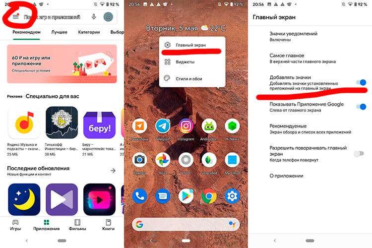 Вместо того, чтобы каждый раз наводить порядок вручную, удаляя неиспользуемые ярлыки и перемещая имеющиеся, проще один раз запретить новым приложениям создавать иконки на главном экране. Сделать это можно прямо из Google Play. Достаточно открыть настройки — три полосы в левом верхнем углу — и в выпадающем меню снять галочку с пункта «Добавить значки на главный экран». Если вы такую не нашли, то просто прижмите палец к любой части дисплея и подержите какое-то время. Всплывет меню, в котором вы найдете нужный пункт.