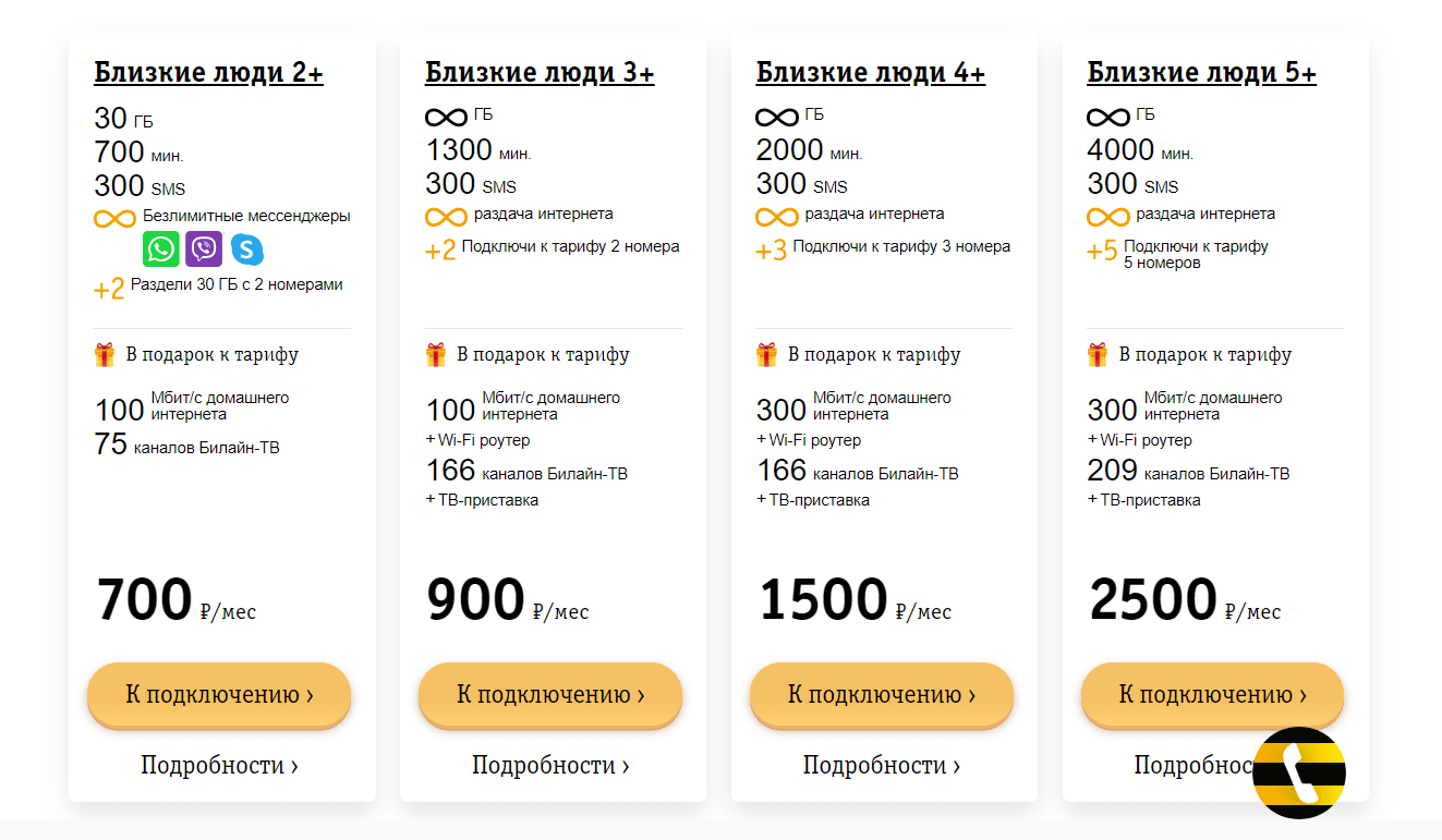 Одна из самых продвинутых линеек семейных тарифов у «Билайна», она называется «Близкие люди». Различаются тарифные планы этой линейки пакетами услуг, абонентской платой и количеством людей, которых можно подключить. Число последних варьируется от 2-х до 5-и.