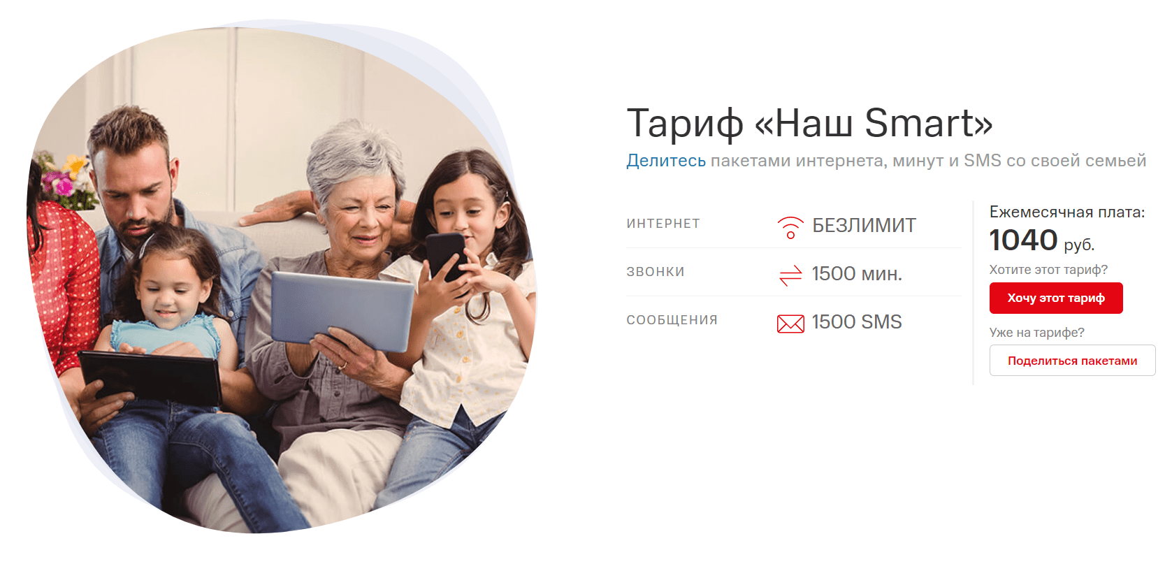 Схожее предложение есть и у МТС, правда, с более скромным набором услуг, но и меньшей абонентской платой. Тарифный план «Наш Smart» предоставляет абоненту 1500 минут разговора, столько же SMS и безлимитный интернет на основном номере. К последнему можно подключить до 5-и дополнительных номеров и делиться с ними предоставленными пакетами. С той оговоркой, что безлимитный интернет будет только на основном номере, дополнительным придется ограничиться 25 ГБ трафика.