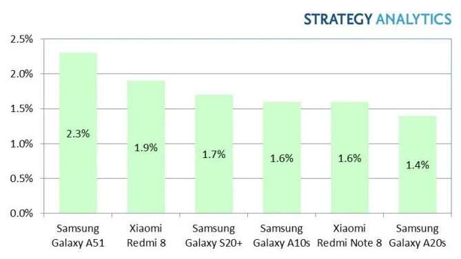 Как свидетельствует отчет авторитетной компании Strategy Analytics, самым продаваемым смартфоном первой половины 2020 года стал Samsung Galaxy A51. На него приходится 2.3% от всех проданных в мире Android-устройств.