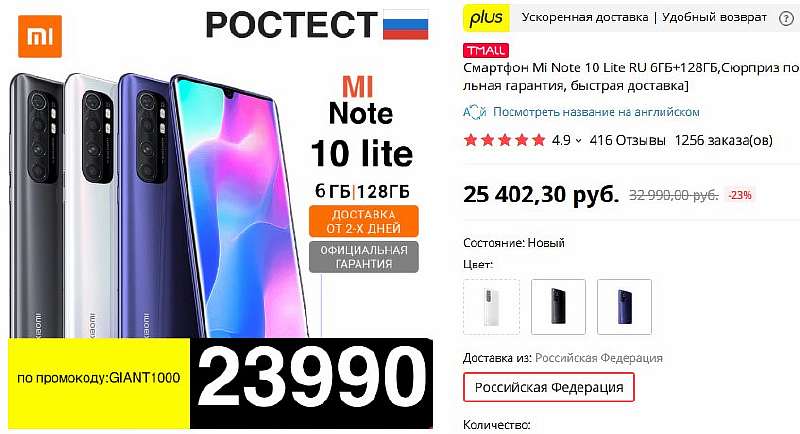 Крайне выгодную акцию на Mi Note 10 Lite мы нашли в интернет-магазине TMall. Ростестовский девайс, с официальной гарантией и быстрой доставкой из России отдают за 23 990 рублей. Это всего на 1-1.5 тыс. дороже, чем он стоит на Aliexpress и в непонятных серых магазинах.