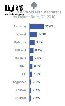 Среди китайских производителей самое нестабильное качество у Xiaomi – 14% брака, Motorola (принадлежит компании Lenovo) – 9.6% и Huawei – 8.4%. Замыкает анти-топ бренд OnePlus, у которого 2.5% поломок.