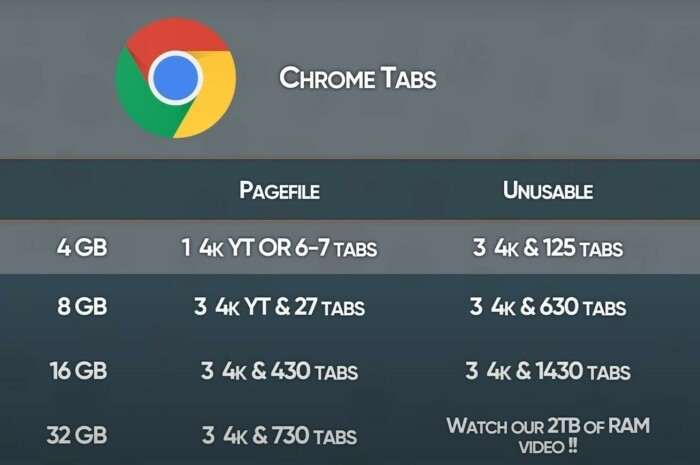 Минимальный объём оперативки DDR4 для современных систем составляет 4 ГБ в одноканальном режиме. Учитывая, что только Windows 10 без запущенных программ занимает 2 ГБ, а всего одна вкладка с 4К видео на YouTube кушает оставшиеся 2 ГБ, такого объема явно не достаточно. С 4 ГБ ОЗУ вы сможете комфортно держать открытыми всего 6-7 активных вкладок, на которых расположены простенькие сайты с текстом, сбои в работе Google Chrome наступят уже на отметке 125 вкладок.