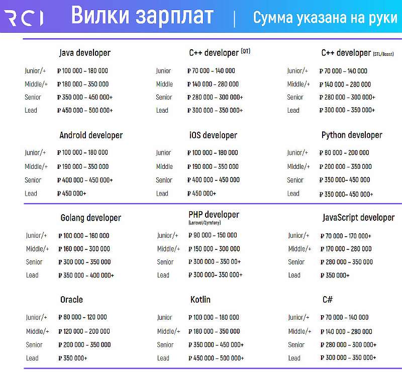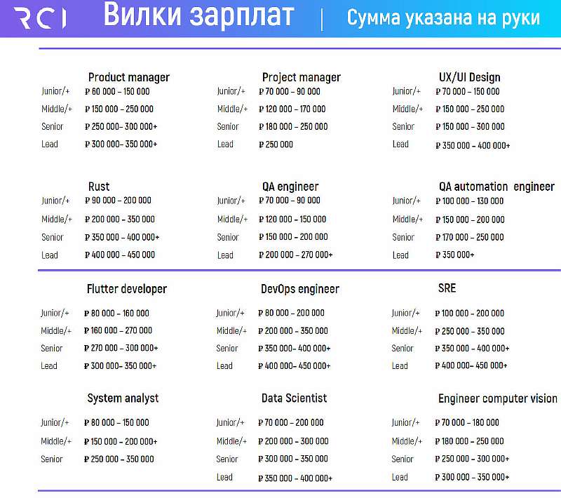 В ходе исследования RCI проанализировали 30 тысяч резюме и 15 тысяч открытых в России вакансий. Согласно результатам, в большинстве ИТ-профессий минимальная вилка начинается от 100 тысяч рублей на руки.