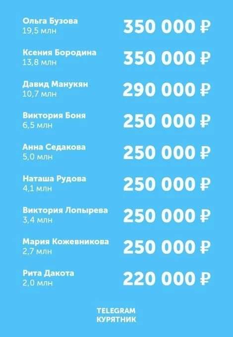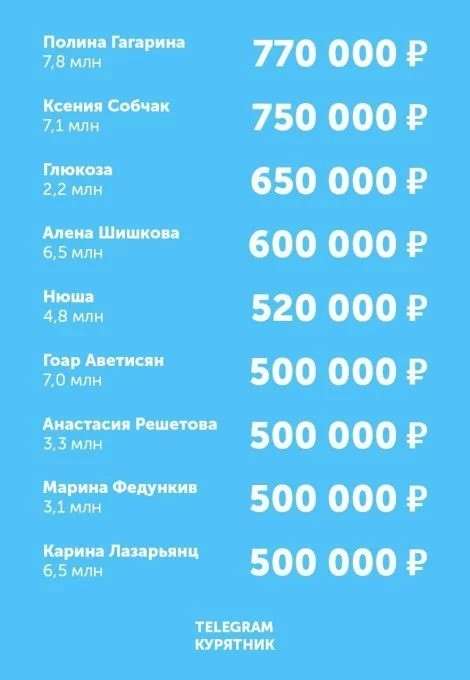 В пятерку попали Анастасия Ивлеева — 1,07 миллиона и Яна Рудковская — 1,05 миллиона рублей. И чем дальше по списку, тем яснее видно, что количество подписчиков не очень сильно коррелирует с расценками знаменитостей.