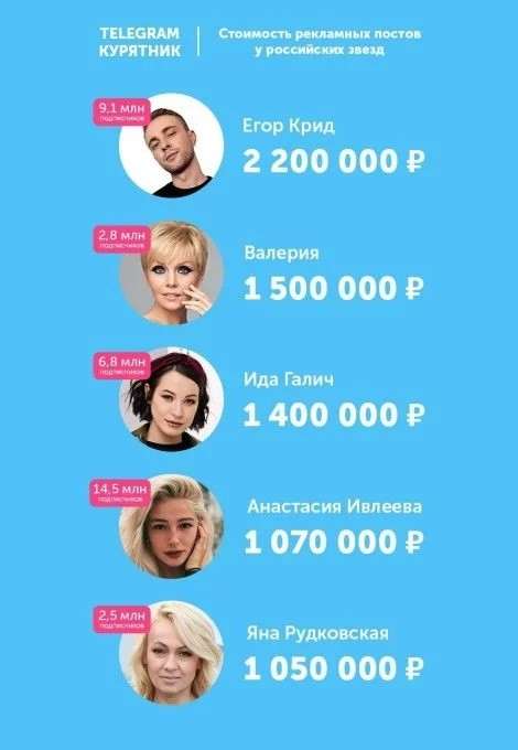 Если верить данным, самая дорогая реклама в инстаграме у Егора Крида — 2,2 миллиона за пост. Фантастическое число, но вполне ожидаемое, если держать в голове тот факт, что у Крида 9 миллионов подписчиков. Следом идет певица Валерия, одна рекламная запись на ее аккаунте обойдется 1,5 миллиона рублей. Это довольно дорого, учитывая, что подписоты у Валерии вчетверо меньше. Замыкает тройку лидеров Ида Галич с показателем 1,4 миллиона за пост.