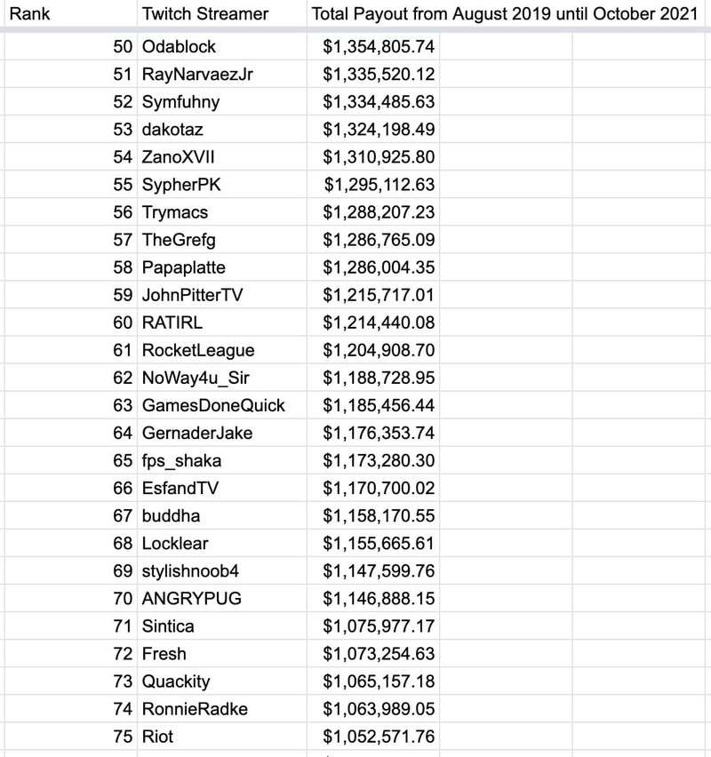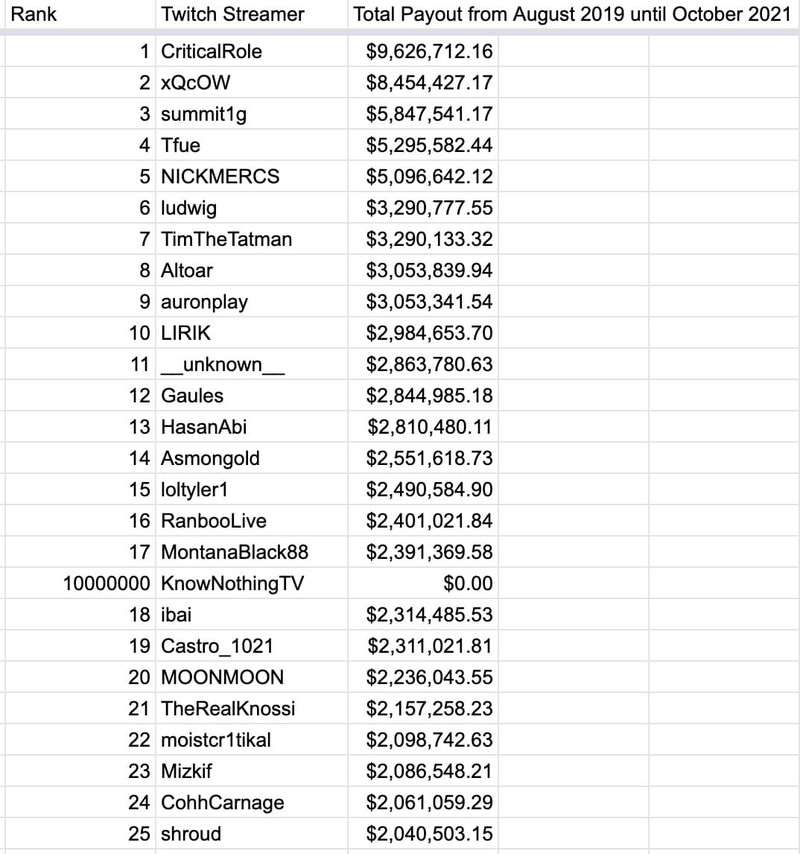 Пользователей, понятное дело, больше всего заинтересовали данные о доходе стримеров. Так, выяснилось, что в период с августа 2019 года по октябрь 2021 года владелец канала CriticalRole заработал 9 626 712 долларов (данные до вычета налогов). Второе место в топе по выплатам занял один из самых популярных стримеров – xQcOW, который пополнил свой бюджет на 8 454 427$. Замкнул тройку лидеров summit1g с доходом 5 847 541$.