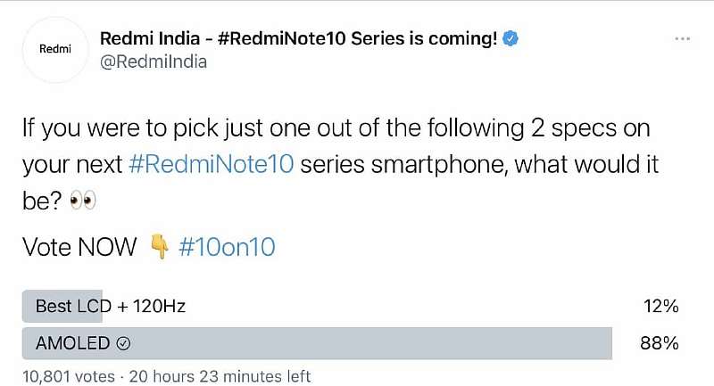 А вот с экраном Redmi Note 10 все получается очень интересно. В официальном Твиттере бренда вчера запустили опрос, где фанатам предлагалось выбрать между 120-герцовой IPS матрицей и 60-герцами, но AMOLED. Подавляющее большинство пользователей проголосовало за последний вариант, после чего публикацию оперативно удалили.