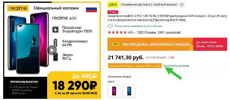 Обычно Realme 6 Pro стоит 22-24 тысячи, и даже по фулпрайсу он получается выгоднее, чем главный конкурент в лице Redmi Note 9 Pro. Но сейчас аппарат с 8/128 ГБ памяти можно забрать за 18 290 рублей, и это действительно топовое предложение. Вот ссылка на акцию, чтобы получить скидку нужно взять купон на странице товара и при оформлении заказа в корзине использовать промокод BACK1600.