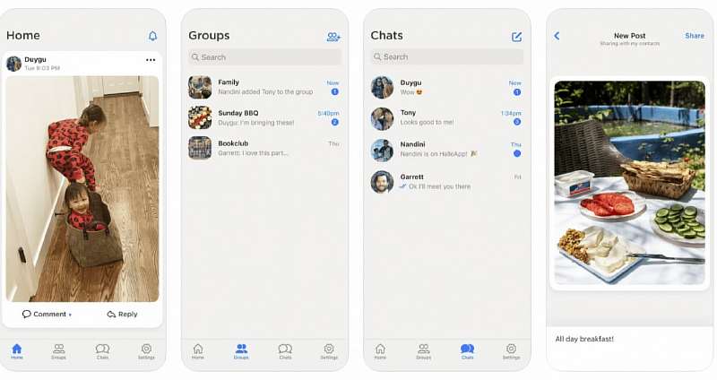Всего в HalloApp четыре раздела: лента с сообщениями друзей, групповые и личные чаты, а также меню с настройками. У приложения максимально простой дизайн без встроенной рекламы – создатели планируют монетизировать свой продукт другими способами.