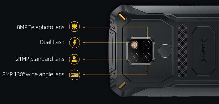 Основная камера в S68 Pro тройная, состоит из модулей на 21+8+8 МП (дополнительные объективы – телевик и автофокусный ширик с поддержкой макро-режима). Также имеется NFC модуль и сканер отпечатков пальцев, работает смартфон под управлением ОС Android 9 Pie.