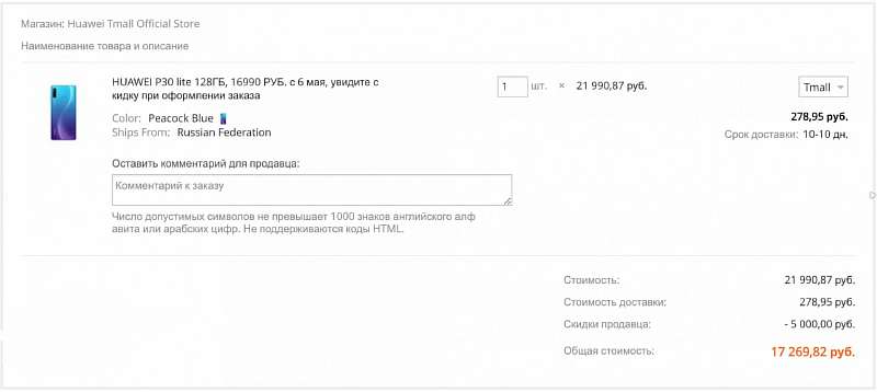 Дополнительные 500 рублей скидки можно получить по промокоду MAYSKIE500. Также c Tmall работают все актуальные кэшбек сервисы, что позволяет сэкономить еще сильнее. В общем, акция действительно выгодная. Желающим приобрести P30 Lite рекомендуем не затягивать, так как ни количество доступного товара, ни продолжительность распродажи, Tmall не указывает.