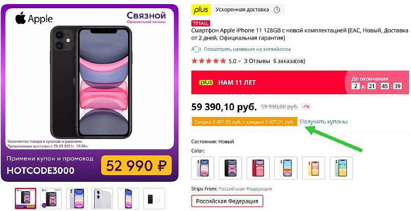 В Связном пока что доступны все расцветки iPhone 11, но акция будет длиться только три дня – до 3 апреля. Для скидки юзайте промокод HOTCODE3000, а для 128 гиговой версии нужно дополнительно применить купон, который висит на странице товара. Ниже оставим все необходимые ссылки:
