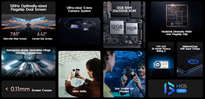 Внешний дисплей имеет диагональ 6.42-дюйма (против 6.2″ у Fold4), разрешение 2550х1080 пикселей и частоту обновления 120 Гц. Основной экран – 7.85 » (против 7.6 «), 2296х2000 точек, развертка 120 Гц. Tecno заявляет, что смартфон выдерживает до 200 000 складываний, такого запаса надежности должно хватить на 5 лет эксплуатации девайса.