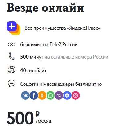 Тариф «Везде онлайн» предназначен для активных пользователей, совершающих много звонков и часто пользующихся интернетом. При абонентской плате 500 рублей (МСК) он предлагает пакет из 40 ГБ трафика, 50 СМС и 500 минут на номера по России, а также безлимитные звонки внутри сети Теле2.